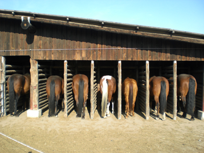 Pro Herde bietet der Laufstall Platz für 8 Pferde, die rund um die Uhr Heu zur Verfügung haben. Zu jedem Offenstall gehören Fressstände, ein geräumiger Unterstand, der zu allen Seiten Wetterschutz bietet, sowie einen Sandpaddock von je 1 ha. Außerdem gibt es vom Frühjahr bis einschließlich Herbst uneingeschränkten Weidegang auf einer Fläche von je 6ha. Zwischen November und April wird außerdem einmal täglich Hafer gefüttert. |